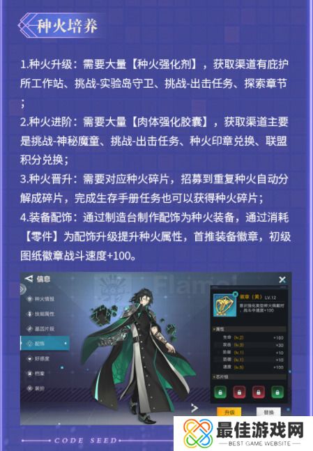 通过制造平台制作配件作为植火装备,通过消耗【配件】升级配件的种火属性,先推装备徽章,初级绘图徽章战斗速度+100。