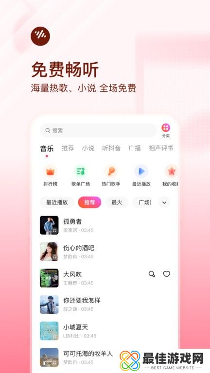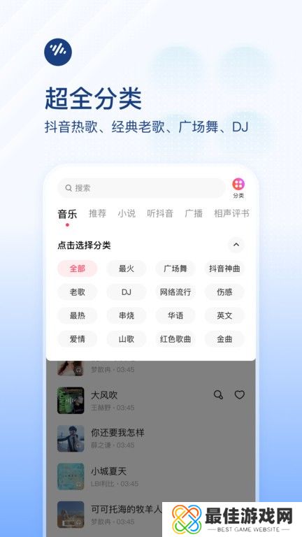 1.超全分类:热门歌曲、经典老歌、方块舞、中国流行DJ、轻音乐、童谣等各类歌曲一应俱全。