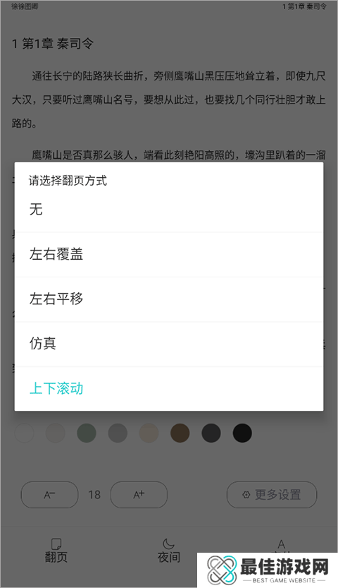 3、最后页面会弹出一个请选择翻页方式,有左右覆盖、左右平移、仿真、上下滚动多种方式,选择你喜欢的就行。
