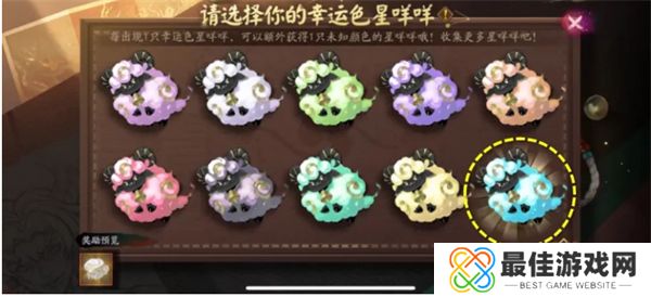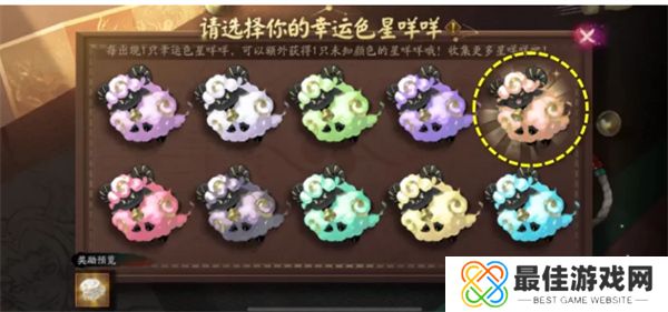 2、然后是选择幸运色星咩咩,这里有个小技巧,如果,如果一直选同一只羊,最后及格的概率不到50%,但如果在两种颜色的羊中反复横跳,间隔选择,胜率超50%以上的概率会大大提升,接近80%。