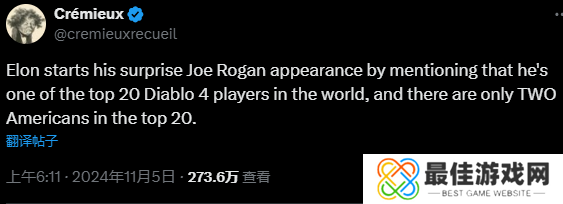 马斯克杀入《暗黑4》深坑TOP20 成为唯二美国玩家