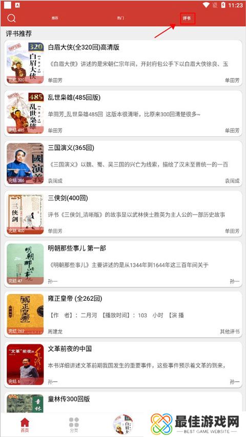 老白故事如何找评书1、通过首页标签进行寻找:在首页界面的上方红**域,滑动找到“评书”。