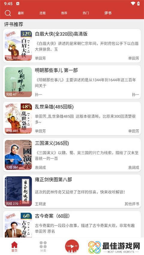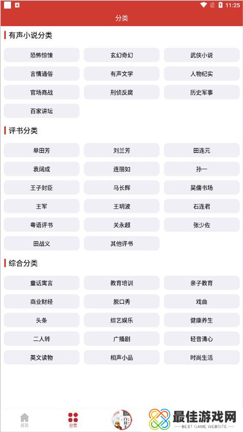 2、通过分类进行寻找:在底部点击“分类”,便会出现“评书分类”,根据用户喜好和需求选择评书讲解员。