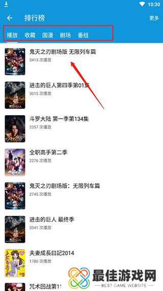 3、在排行榜中可以获取最受大家喜欢的动漫是什么,为大家提供了播放、收藏、国漫、剧场、番组等榜单,可以看到播放第一是大家都在寻找的鬼灭之刃剧场版无限列车篇;