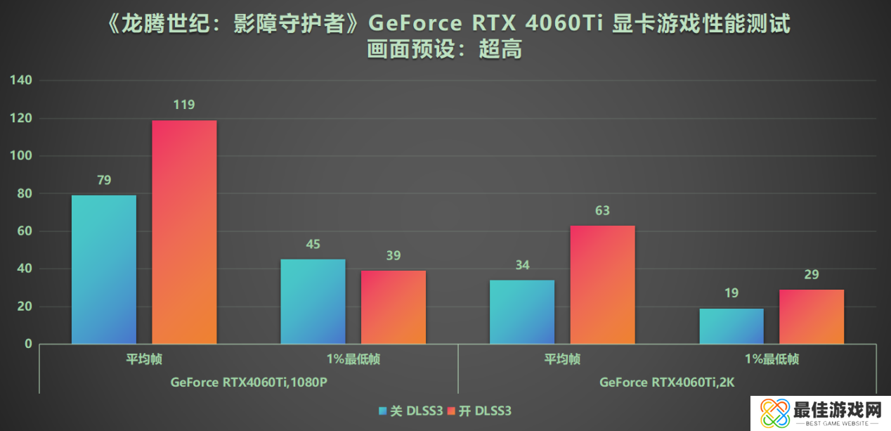 而在2K分辨率设置下,虽然不开DLSS 3时游戏仅能达到34帧,比GeForce RTX 4060同设置低一点,但在开启DLSS 3之后的提升却来得更加飞跃性,一举提高85%来到63帧。