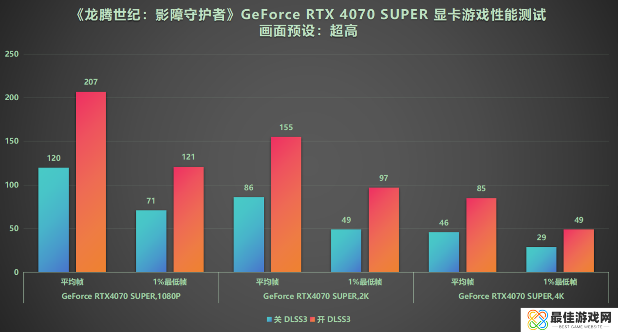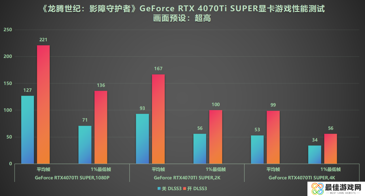 设置1080P、超高预设、关闭DLSS 3后能来到127帧,开启DLSS 3后能来到221帧;2K分辨率下,DLSS 3开关前后分别为93帧和167帧;4K分辨率下则为53帧和99帧。可以说,对于想在4K画质下畅玩《龙腾世纪:影障守护者》的玩家来说,GeForce RTX 4070 SUPER和GeForce RTX 4070Ti SUPER算是一个不错的选择。