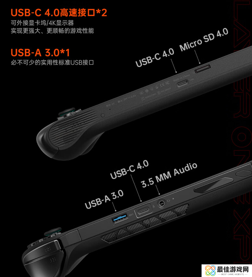 接口方面,这款掌机有 2 个 USB-C 4.0、1 个 USB-A 3.0、1 个 TF 卡接口以及 1 个 3.5mm 音频接口。