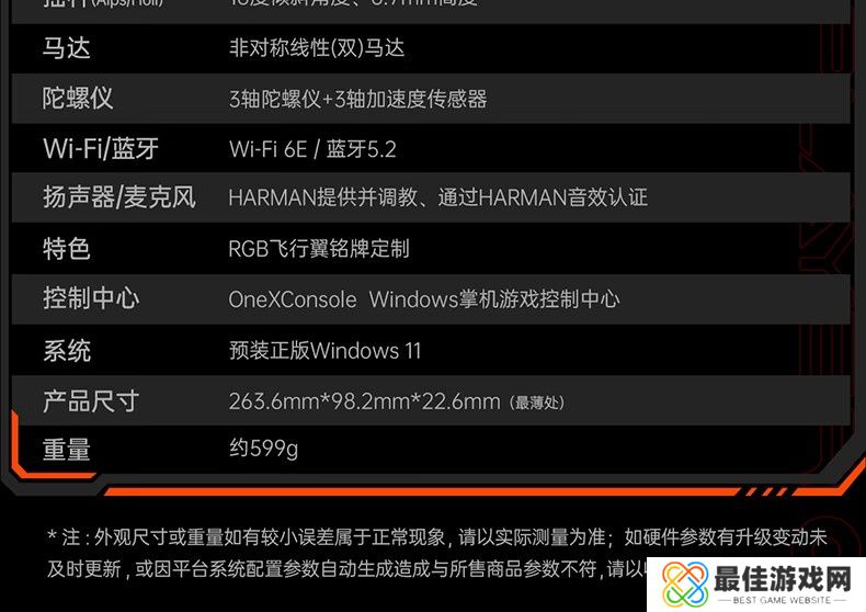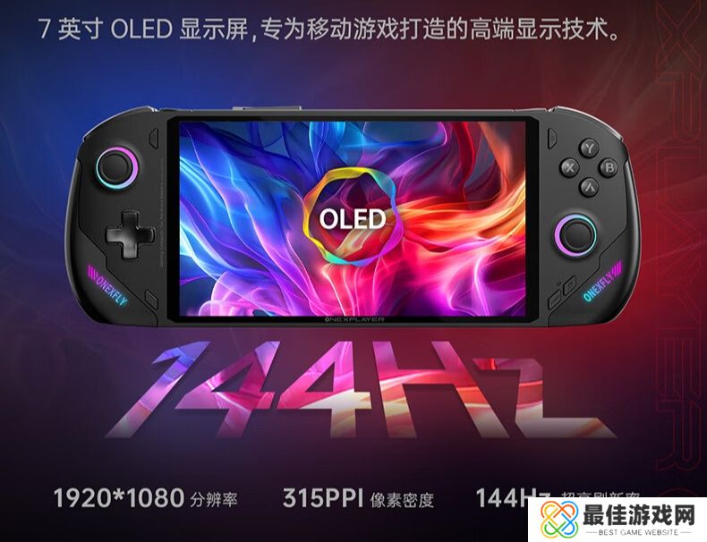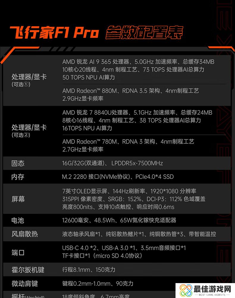 OneXPlayer 飞行家 F1 Pro 掌机搭载 7 英寸 1080P 144Hz OLED 显示屏;48.5Wh 电池、附赠 65W 氮化镓快充适配器;重约 599g,内置“非对称线性双震动马达”。