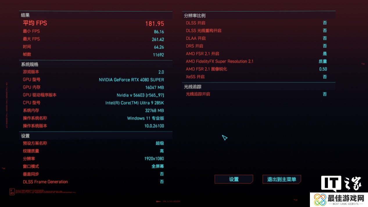 第五款是《赛博朋克:2077》,选择 1080P 分辨率 + 超级画质运行游戏自带基准测试,酷睿 Ultra 9 285K 游戏平均帧数为 182 帧,1% Low 帧 86 帧。
