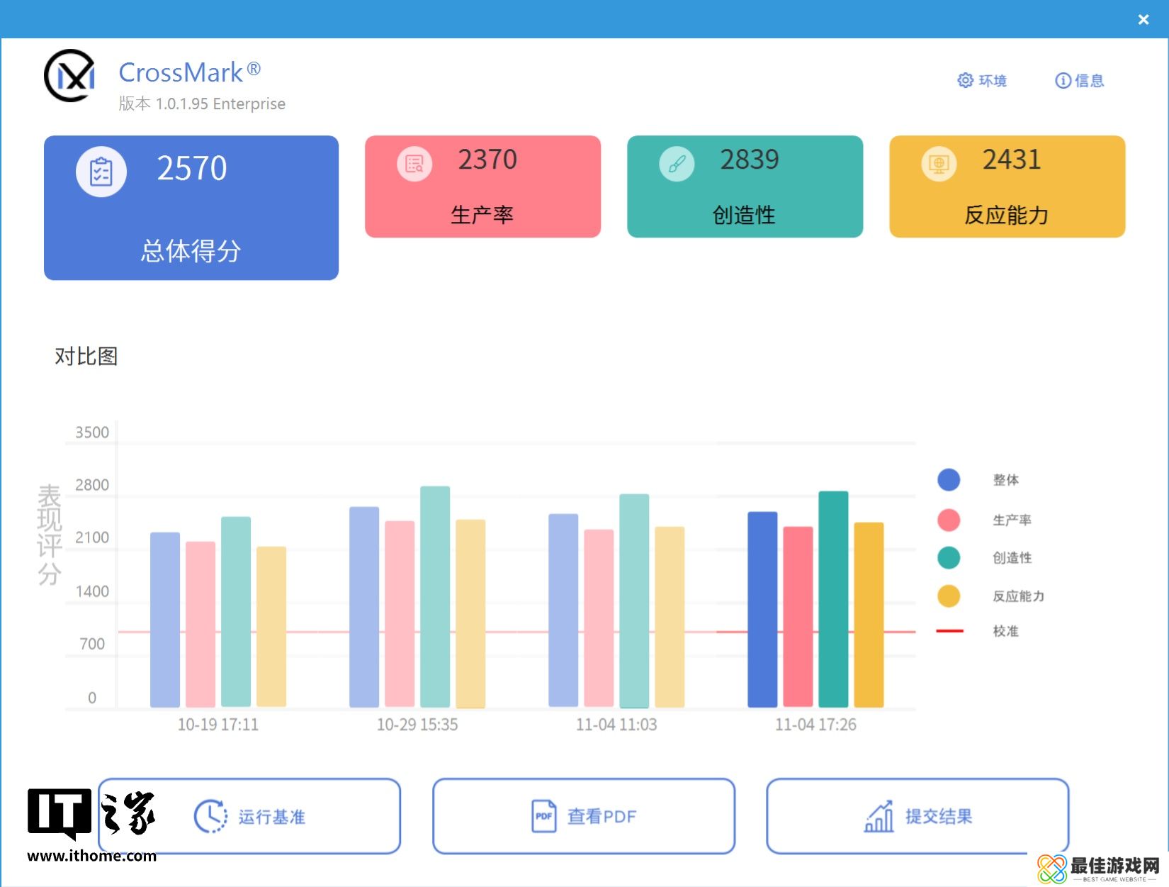 在 CrossMark 中,酷睿 Ultra 9 285K 继续刷新记录,综合成绩达到了 2570 分,创造性得分 2839 分。