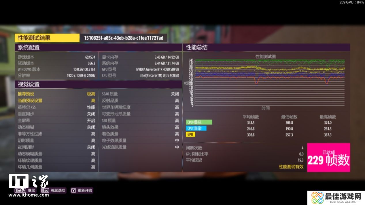 第三款《极限竞速:地平线 5》,选择 1080P 分辨率 + 高画质预设运行游戏自带基准测试,酷睿 Ultra 9 285K 游戏平均帧数为 229 帧。