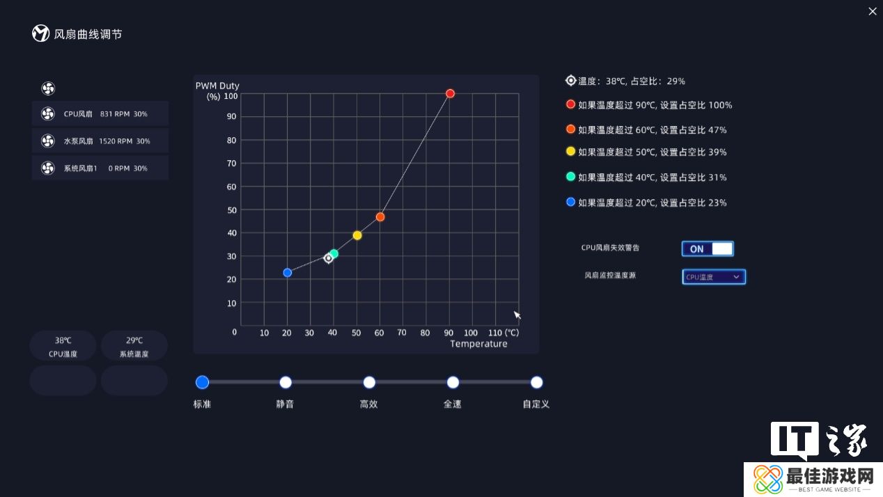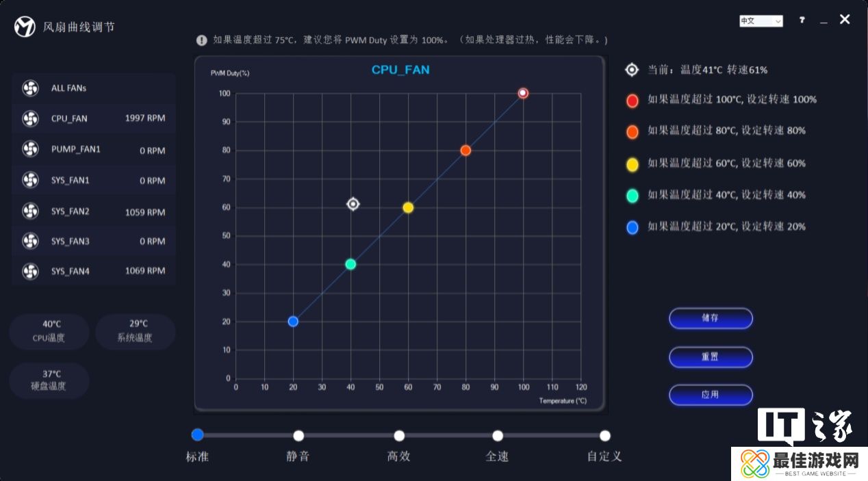 风扇的转速调节界面也很容易懂,有四种预设的转速模式可以选,或者你可以直接自定义,自己手动调整不同温度下的风扇转速。