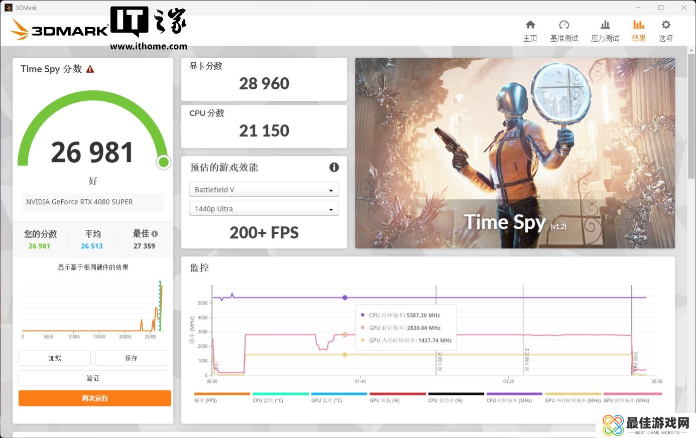 在 3D Mark Time Spy 跑分测试中,酷睿 Ultra 9 285K 的 CPU 分数为 18569 分,略微偏低。整个理论测试环节,铭瑄终结者 Z890-A Wi-Fi 主板的发挥较为稳定,能够释放出酷睿 Ultra 9 285K 处理器的绝大部分性能。