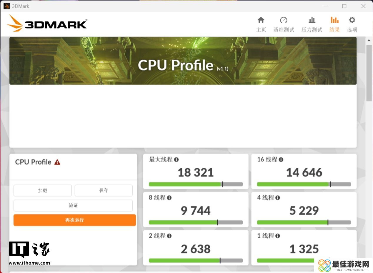 在 3D Mark CPU Profile 的测试中,酷睿 Ultra 9 285K 最大线程分数为 18321 分,单线程分数 1325 分,其最大线程得分较为亮眼。