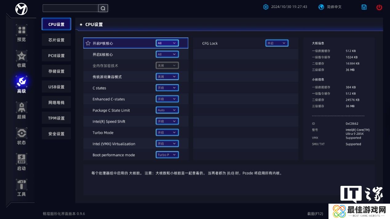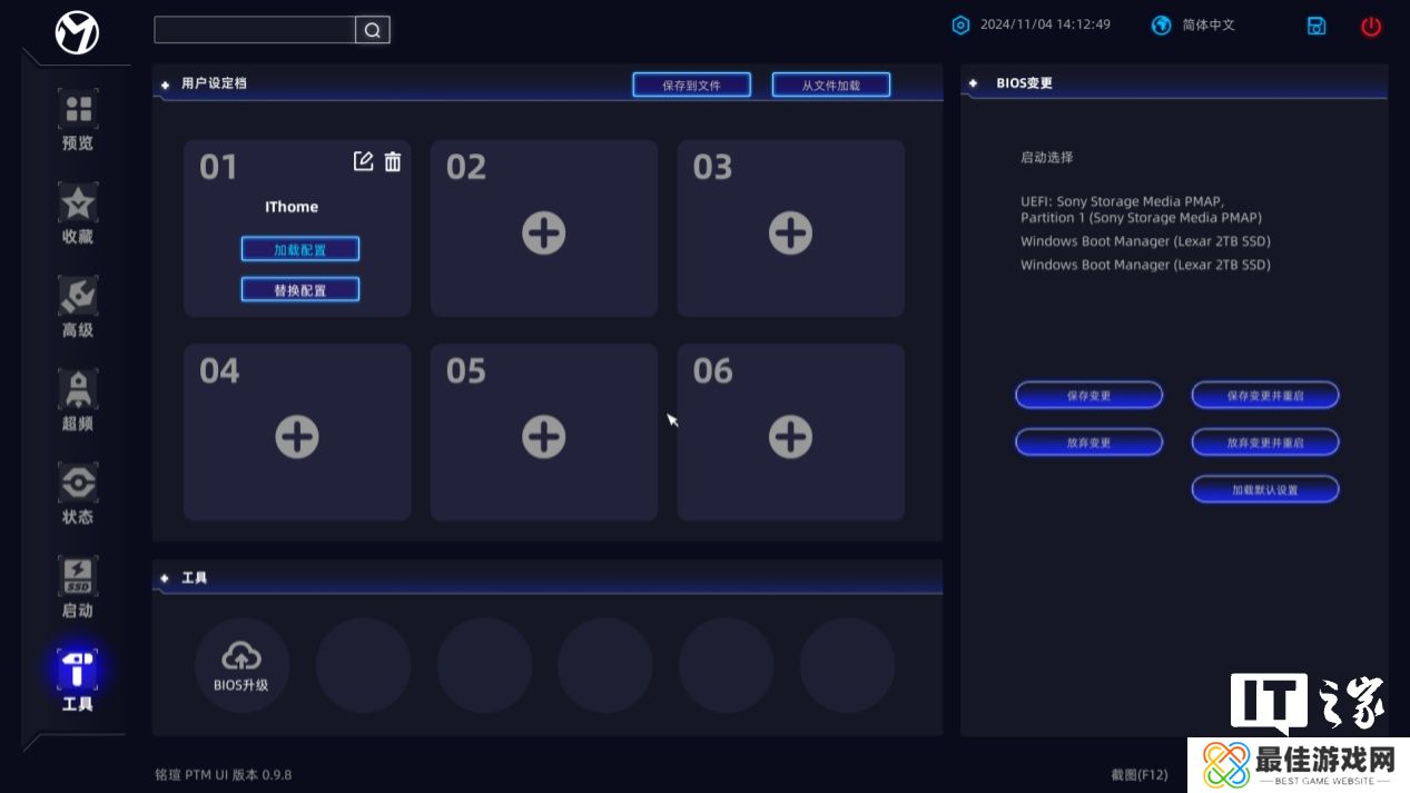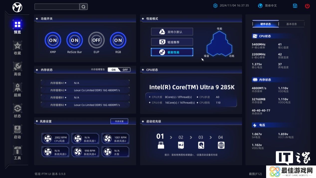 在以前,铭瑄主板的 BIOS 经常被吐槽有“时代感”。而这次伴随铭瑄 Z890 主板新品首发的,还有经过全新设计的 BIOS。改版后的 BIOS 界面以科技感十足的蓝色为主色调,点亮的按钮还有光晕效果,很是精致。