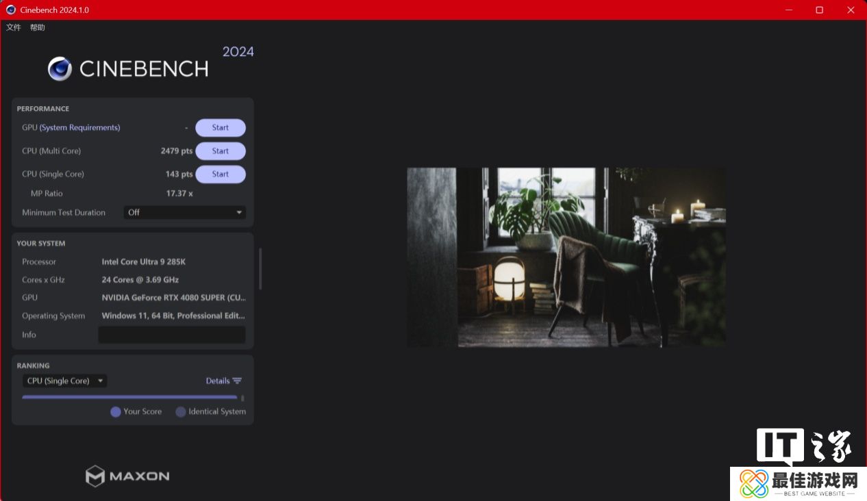 在 CineBench 2024 测试中,酷睿 Ultra 9 285K 获得了单核 143 分,多核 2479 分的成绩,是我们测过最好成绩,甚至要高于之前所测的北冰洋 Z890,正常默频成绩应该是单线程 140-141 分,多线程 2350-2400 分左右。
