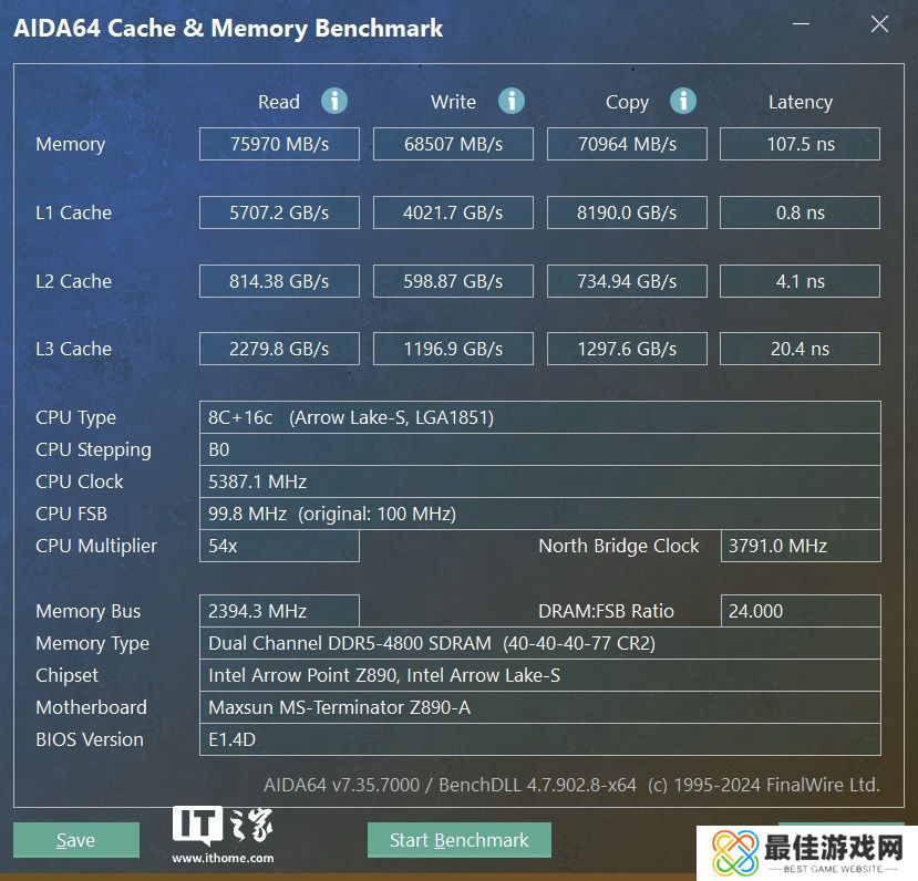 上述成绩属于 4800MHz 频率下的内存正常读写水平,不过大家应该注意到这次的内存延迟受酷睿 Ultra 9 285K 的架构影响,相比上一代 i9-14900K 可能会偏高一点。
