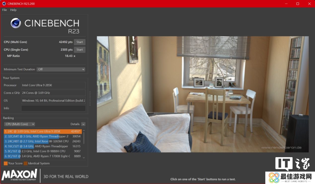 在 CineBench R23 的测试中,酷睿 Ultra 9 285K 跑出了单核 2305 分,多核 42492 分的成绩。