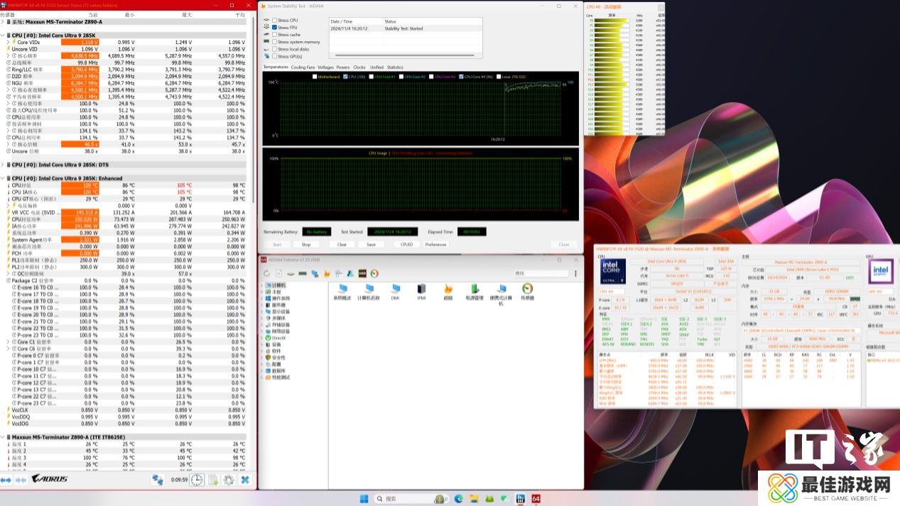 先看烤机,由于铭瑄终结者 Z890-A Wi-Fi 主板的 BIOS 功耗策略比较科学,PL1 直接给到 250W,PL2 无限制。烤机一开始 CPU 功耗冲来到了 287W,CPU 温度也达到了 105°C。随后 CPU 温度降到了 100°C 左右,CPU 功耗也快速稳定在 250W 附近。烤机 10 分钟后,此时 CPU 的 P 核频率最高达到了 5.2GHz,E 核频率则在 4.5GHz 左右。