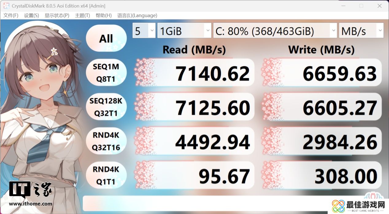 硬盘方面,我们将标称规格为 7450MB/s 顺序读取速度和 6500MB/s 顺序写入速度的雷克沙 NM800 Pro 插在主 M.2 插槽上,在 80% 脏盘的情况下跑到了 7141MB/s 的顺序读取速度和 6660MB/s 的顺序写入速度,符合其应有的水平。