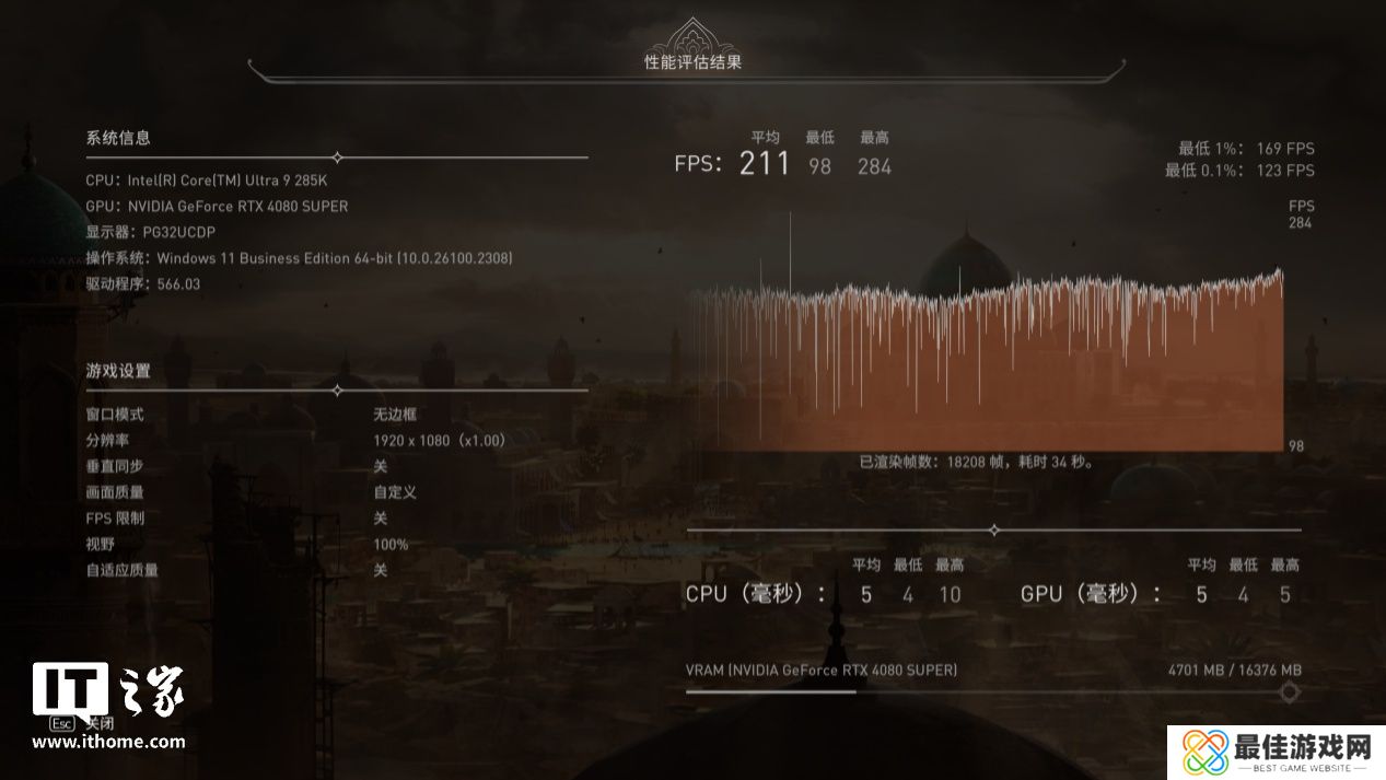 第六款是《刺客信条:幻景》,选择 1080P 分辨率 + 高 + XeSS,并关闭动态模糊,运行游戏自带基准测试。酷睿 Ultra 9 285K 游戏平均帧数为 211 帧,1% Low 帧 169 帧。