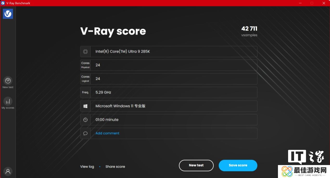 在 3D 渲染软件 V-Ray BenchMark 6 的 CPU 测试中,酷睿 Ultra 9 285K 达到了 42711 分的成绩。