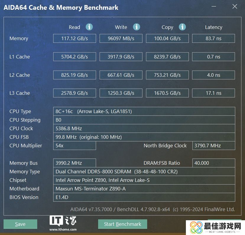 通过铭瑄终结者 Z890-A Wi-Fi 主板的自动 XMP 功能,内存能够跑满 8000MHz,读写性能大幅提升,延迟也有一定下降。