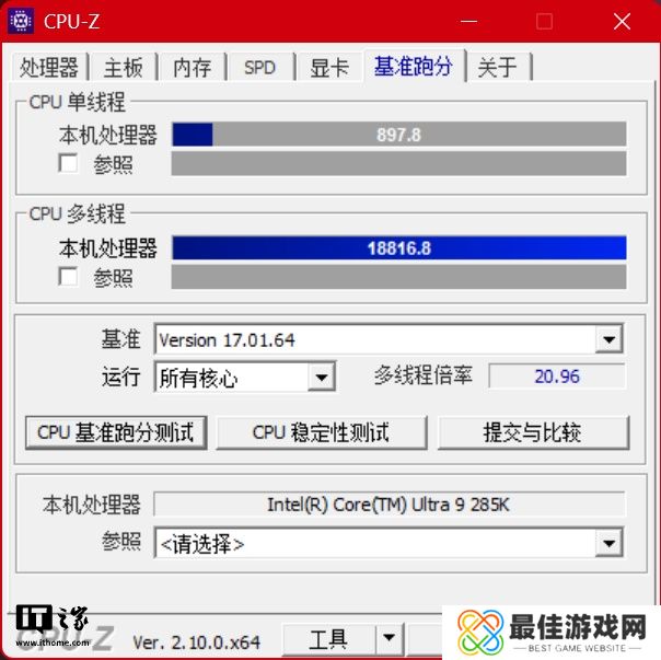 接下来进入理论性能实测,在 CPU-Z 自带的跑分测试中,酷睿 Ultra 9 285K 单核心 897.8 分,多核心 18816.8 分,在我们目前测试过 Z890 主板中属于正常表现。