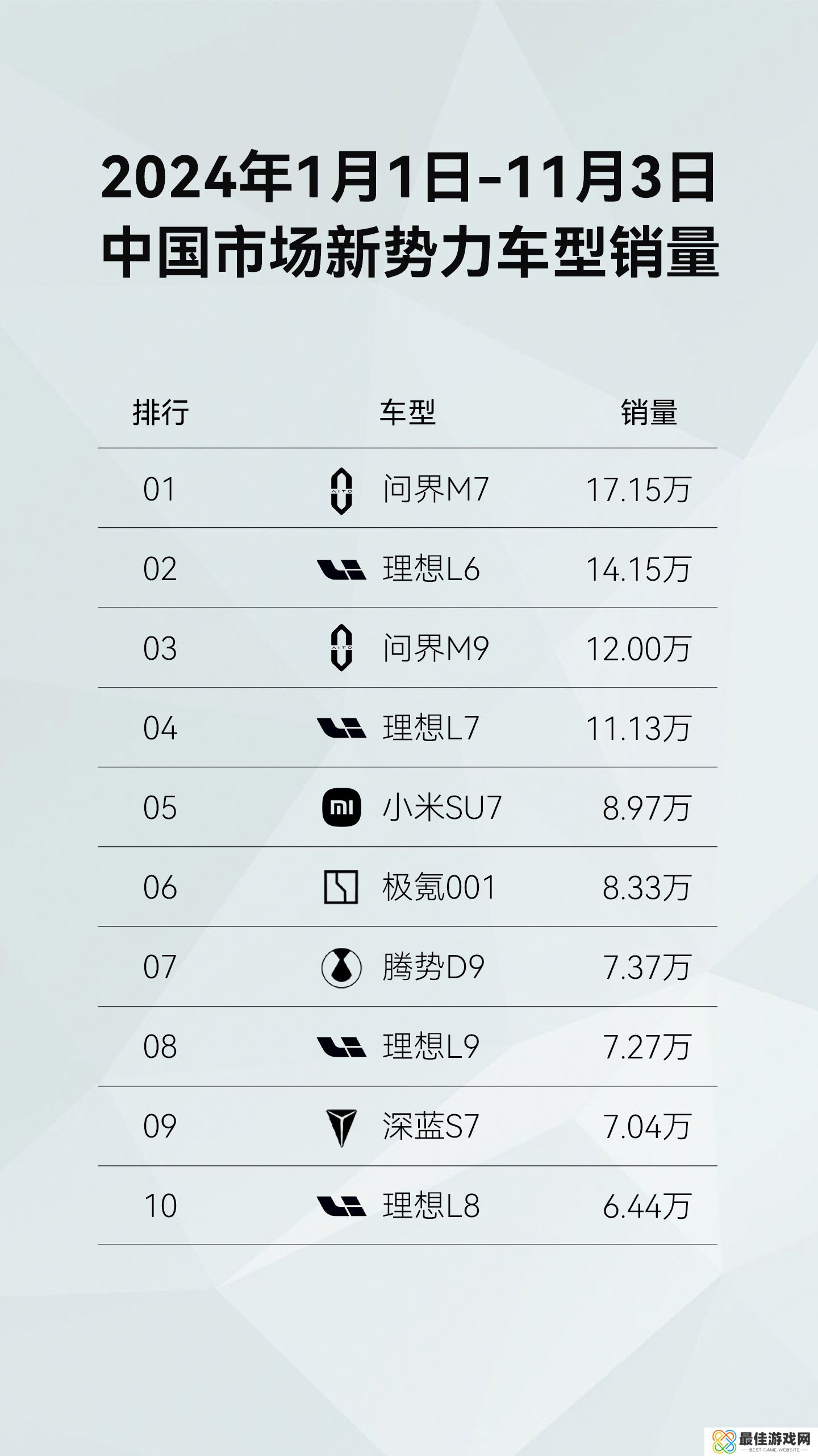 本站 11 月 8 日消息,近日,鸿蒙智行官方公布了问界新 M7 系列最新的销量成绩。根据数据,2024 年问界新 M7 系列交付已超 170000 辆,年内累计销量连续 10 个月蝉联中国新势力销量