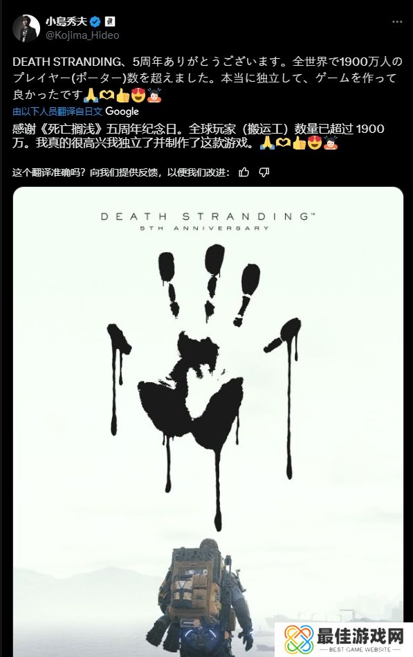 今日(11月8日)是Kojima Productions开发商制作的热门游戏《死亡搁浅》发布五周年纪念日。制作人小岛秀夫为表庆贺发布了五周年纪念图,并表示全球玩家已经超过1900万,真的很高兴!