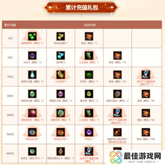 除了限定时装,本次活动还设置了丰富的道具奖励,七个档位的累计充值大礼包中除了包含如轮转玉、超值浮生化身灵匣、超级绿水晶等普通版和经典版共有的奖励外,普通版还有高级如意战斗令、无常玉、鸿蒙玉璞等,而经典版则有特级点化丹、奇遇卷等特色道具。