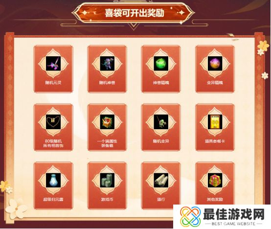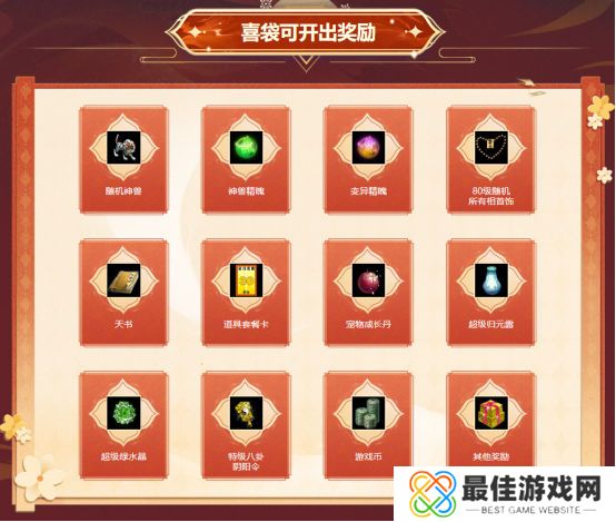 而经典版喜袋的奖池也丝毫不逊色,打开后有概率获取随机神兽、神兽精魄、变异精魄、80级随机所有相首饰等丰厚奖励。