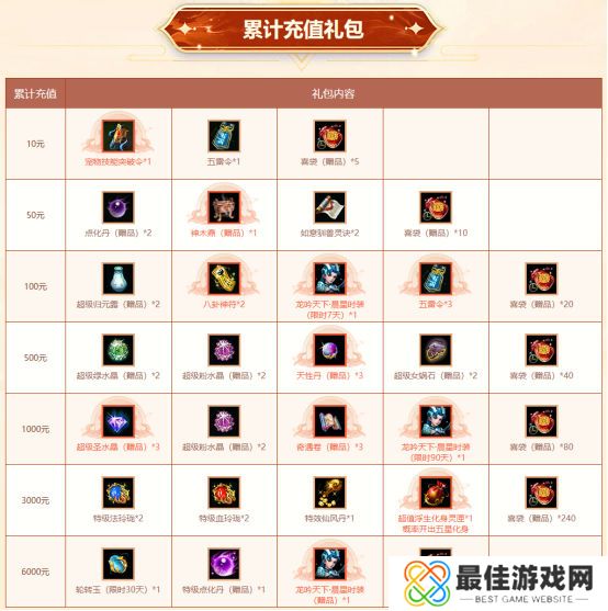 充值分别达到10、50、100、500、1000、3000、6000元时,均可领取对应阶段的累计充值礼包。只需累计充值满100元, 即可获赠限时7天的全新时装——龙吟天下·晨星!