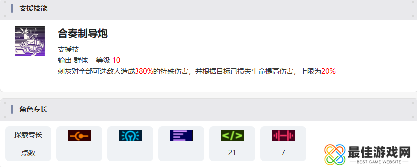 解锁【乘胜追击】技能强化我方使目标退场时,刺灰有50%概率对自身造成30%当前半命的自伤,并释放一次不消耗能级的【合奏制导炮】