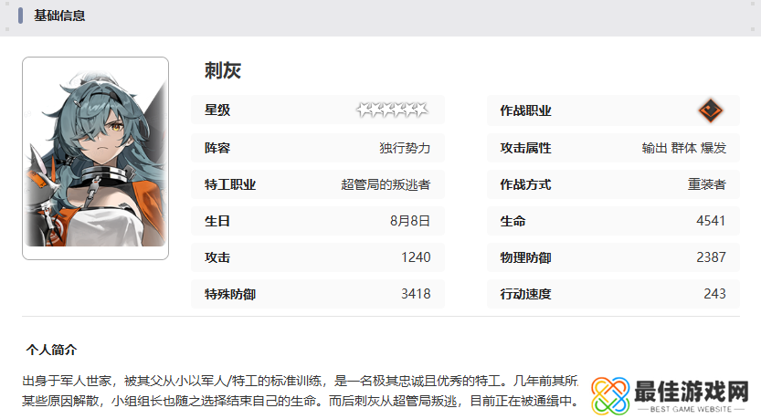 刺灰出身于军人世家,被其父从小以军人/特工的标准训练,是一名极其忠诚且优秀的特工。几年前其所属的外勤小组“金交响”因为某些原因解散,小组组长也随之选择结束自己的生命。而后刺灰从超管局叛逃,目前正在被通缉中。接下来就由小编给大家带来《新月同行》刺灰技能介绍。