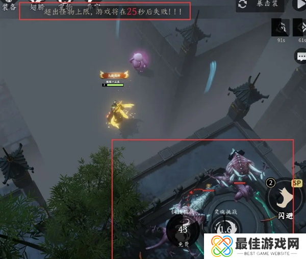 建议是直接使用右下角的闪避技能闪避到地图外面去,然后开启各种挑战(有宠物的情况下),以便快速增加敌方单位数量使其超过一定数量进入游戏倒计时,让游戏失败进行奖励结算。游戏结束会获得500天地元精和40元宝。