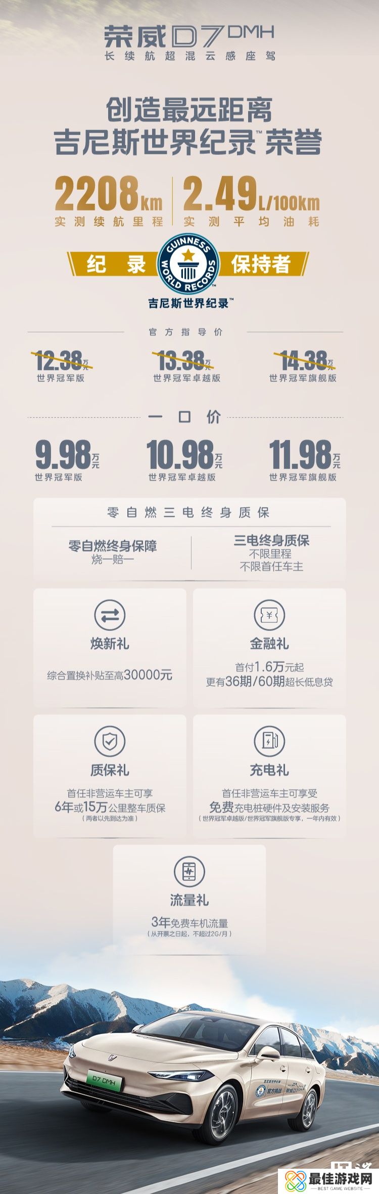 荣威 D7 DMH 世界冠军版此前凭超过 2208.719 公里的续航表现及 2.49L / 100km 的平均油耗,成功夺得“插电式混合动力轿车单次满油满电行驶最远距离”的吉尼斯世界纪录。