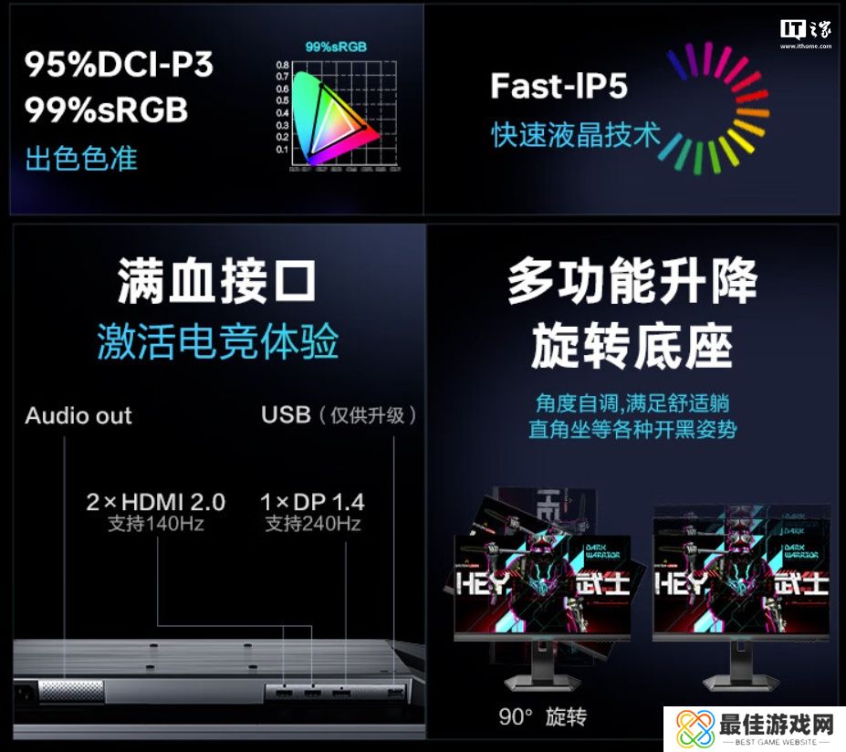 雷神黑武士ZQ25F250L 配有双 HDMI 2.0 接口(本站注:支持 140Hz)、DP 1.4 接口(240Hz)、USB 固件升级接口,搭载旋转升降支架。
