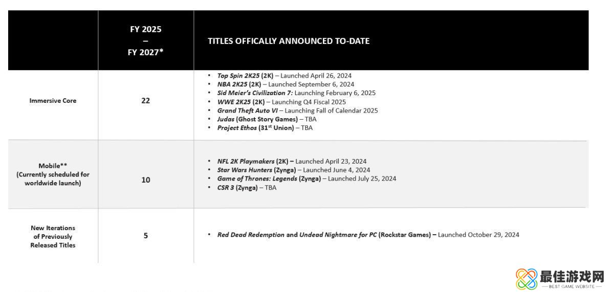 以下是Take-Two正在开发的游戏的详细信息,与上一季度相比没有显著变化。《GTA6》仍计划于2025年秋季发行。唯一的重大变化是由于今天宣布出售Private Division,独立游戏被移除。买家和售价未知。