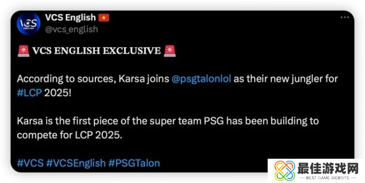 直播吧11月22日讯 VCS英文推特账号官宣,打野选手Karsa将加入PSG担任他们2025年参加LCP联赛的新打野。