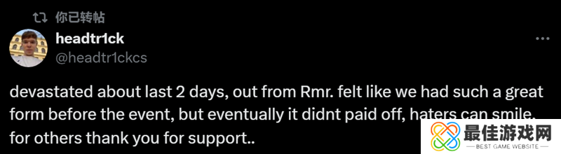 “对过去两天非常失望,我们从RMR出局了。感觉我们在赛前的状态非常好,但最终毫无收获。黑子们可以笑了,至于其他人,感谢你们的支持。”