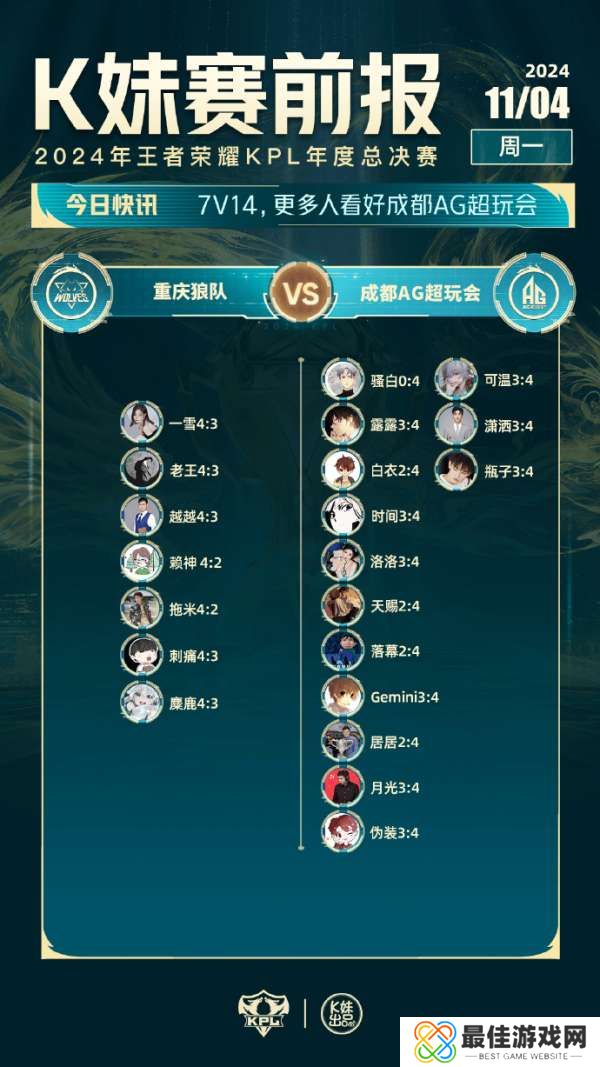 虎扑11月04日讯 更多人看好AG,三分之二嘉宾预计会有巅峰对决!原文如下:2024KPL年度总决赛 淘汰赛D7【K妹赛前报】如约而至!狼队对战AG :7v14,更多人看好成都AG超玩会,21位嘉宾中