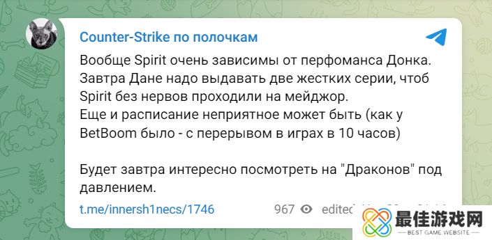 innersh1ne:“Spirit太依赖donk的表现了。他接下来需要连续带飞两个艰难的BO3,才能让Spirit顺利进入Major。