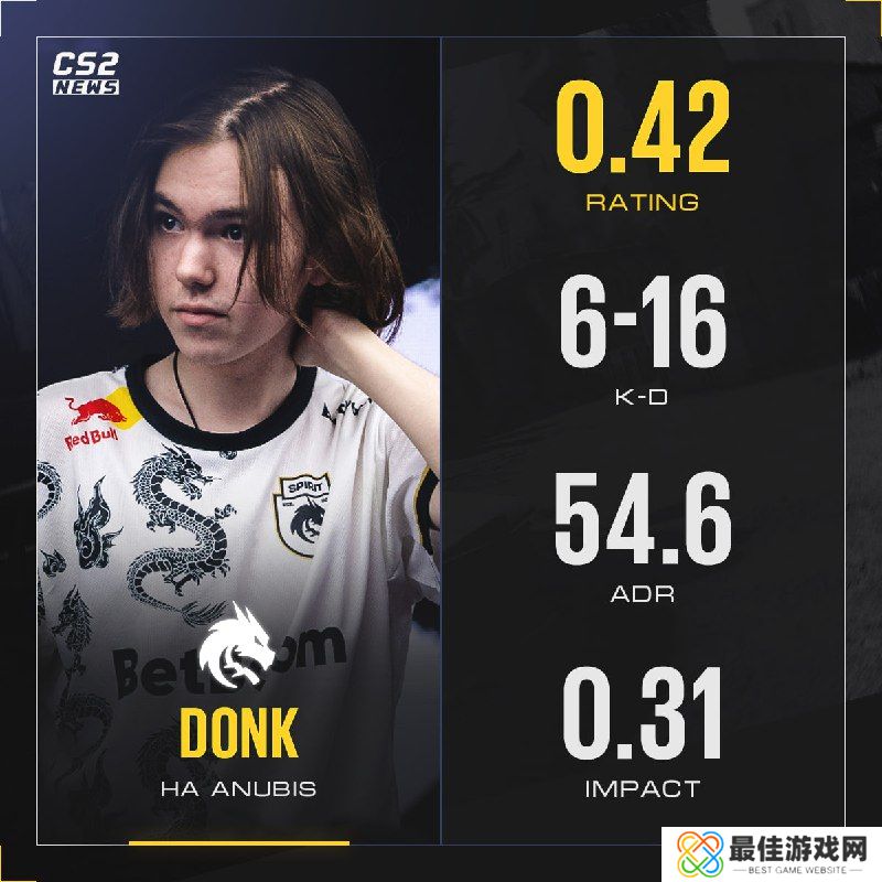 在昨日BLAST Premier世界总决赛最终决战中,Spirit遭状态火热的G2三图横扫,屈居亚军。本场比赛中,备受关注的俄罗斯天才步枪手donk在图二Anubis哑火,仅打出0 42 rating
