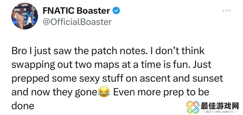 Boaster发文评图池轮换,原文大意如下:兄弟,我看到了新版本的消息。我觉得一次性轮换两张图不咋样呀。我刚为亚海悬城和日落之城准备了很多东西,现在它们要轮换下去了。又要有更多的准备要做了。