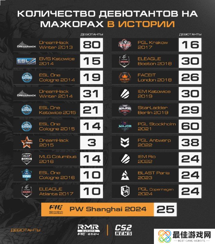 随着欧洲RMR赛事的结束,本次上海Major所有参赛队伍已经确定。在24支脱颖而出的队伍中,总共有25名选手是职业生涯首次参加Major赛事。那么纵观CS Major历史,哪一届Major拥有最多新面