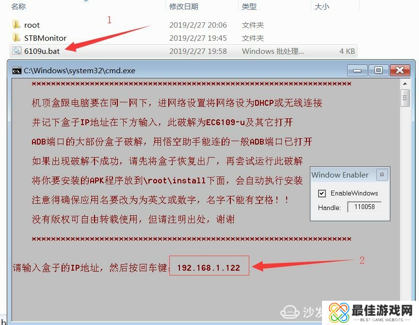 河南联通测试通过,在6108包的基础上修改的,注意:提示命令非法的是STB版本不对,请试着使用STB4.03或升级下机顶盒,适用型号:EC6108V9_V9U_V9E_V9A_V8,EC6109U,暂不适用EC6110M、T破解条件:盒子网线连接,另外一端接路由器,路由器和电脑在同一个局域网内;切勿将盒子连接光猫文件链接::https://pan.baidu.com/s/1cqhx0LjbXoajSi7OC8N6nQ 提取码:s0uo备选链接1:https://share.weiyun.com/Z9loIqtM 密码:zgt8hf备选链接2:https://115.com/s/sw3vb3u3z1i# 访问码:h6c11、打开文件夹中:enabler.exe