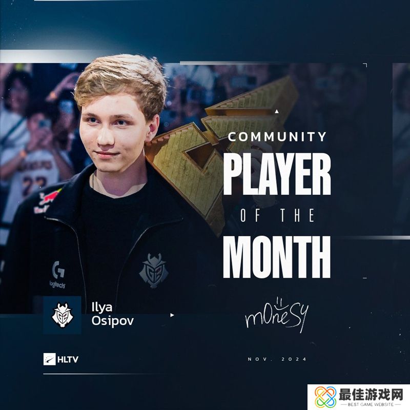 今天HLTV公布了日前评选的11月代表选手评选结果。在四名候选人(m0NESY、ZywOo、donk和NertZ)中,m0NESY最终得票率一骑绝尘,拿到了63.9%的票数,而第二名ZywOo票数为16.7%,第三名donk为11%,NertZ为最后一名,仅有8.4%。