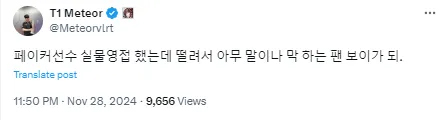 T1无畏契约分部选手Meteor发推特表示自己见到了Faker真人,内容大意如下: