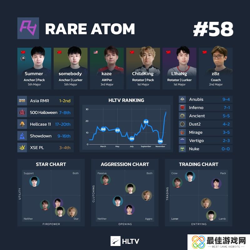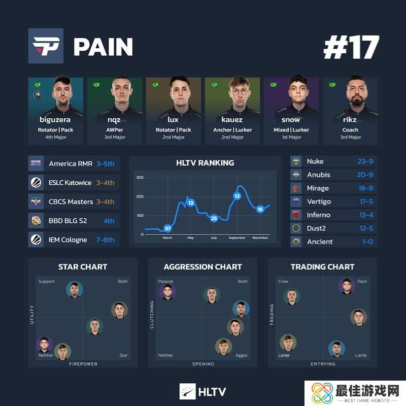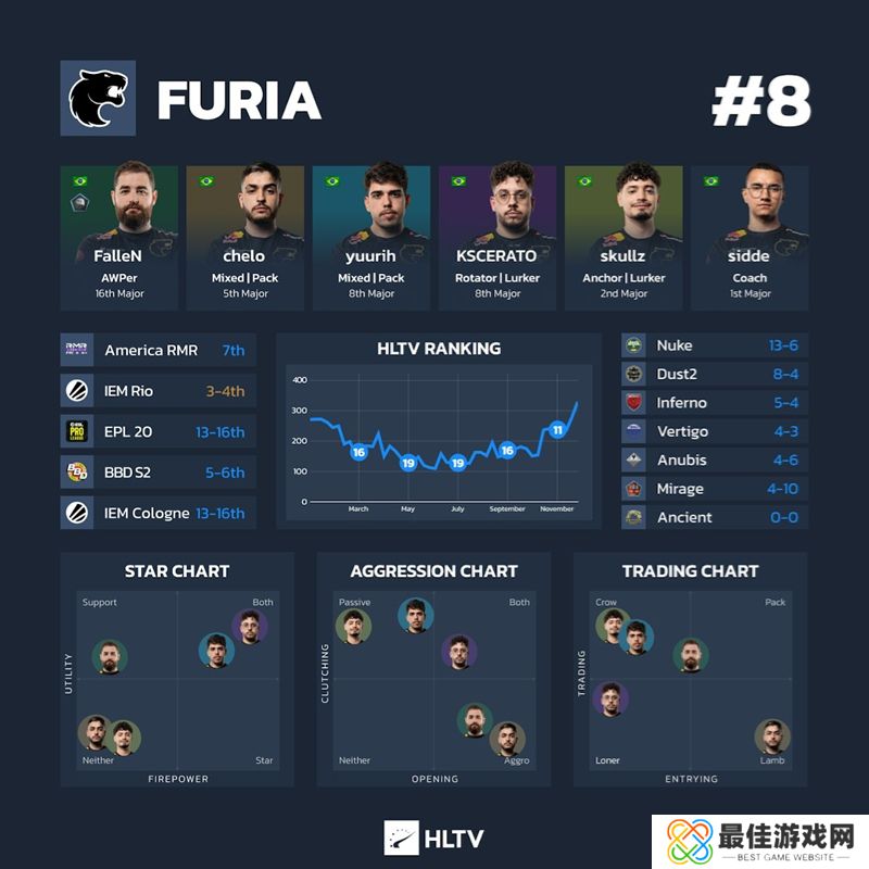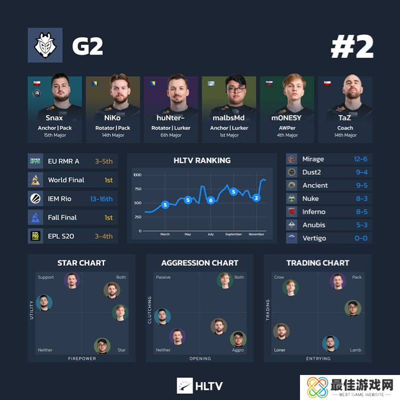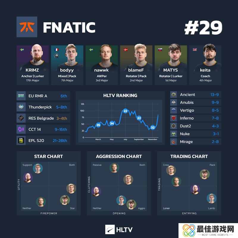 为了让看关门了解上海Major参赛队伍的最新情况,这里有一份关于所有24支参赛队伍的深度信息图表,按照他们的HLTV世界排名排序。